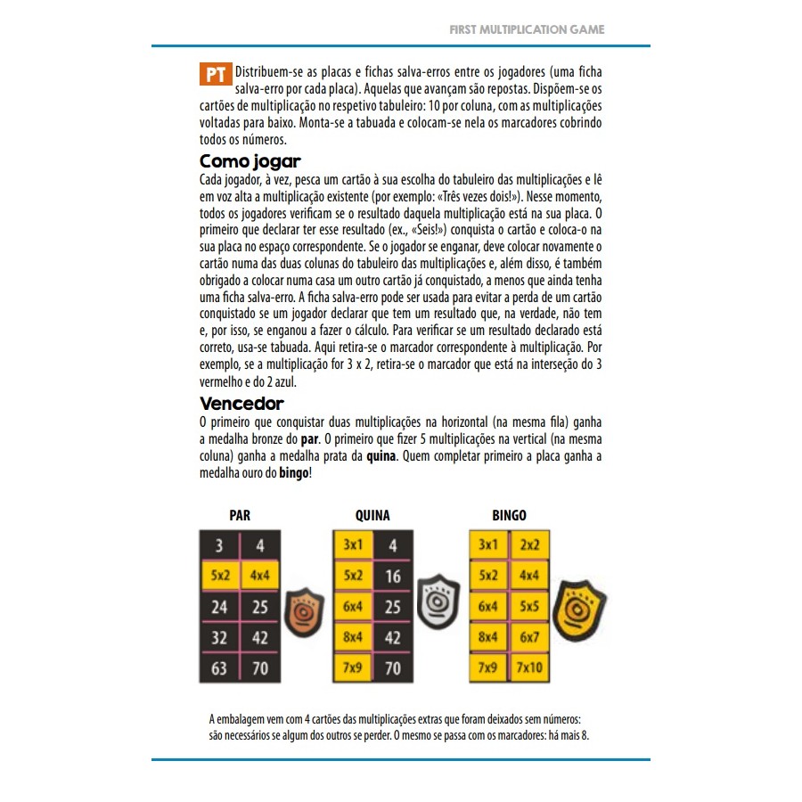 Contém: 10 cartões de bingo; 100 cartas de multiplicação; Contadores de 100 pontos; 1 grande mesa pitagórica; 1 tabuleiro de jogo de multiplicação; 10 "fichas de erro de gravação"; 3 fichas de jogador; Instruções | recomendado dos 6-10 anos | dim caixa:18,8x18,8x6,1 cm