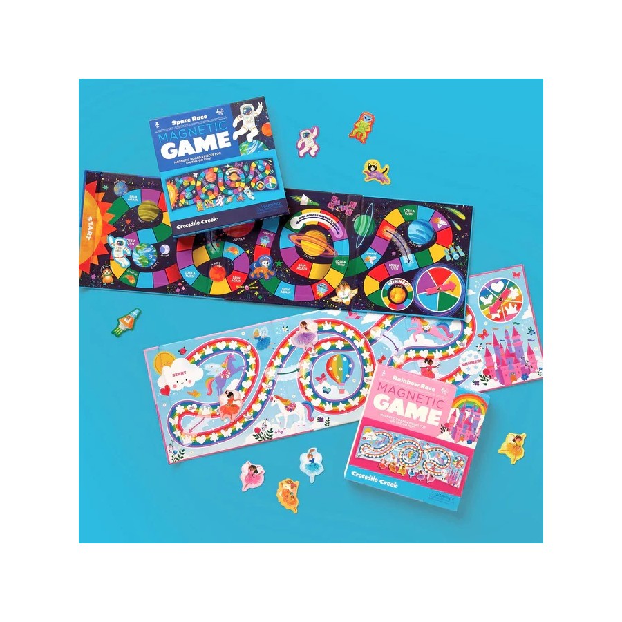 Passeia-te pelo arco-íris com o Rainbow Race! Este jogo magnético dobrável para 2 a 6 jogadores é perfeito para crianças em movimento.