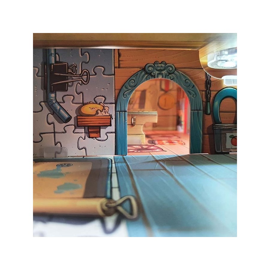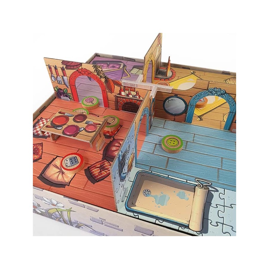 Uma casa de cartão com 8 pequenas janelinhas, esconde objectos banais nas suas divisões. Eles são aleatoriamente lançados pela chaminé e baralhados no início de cada partida.