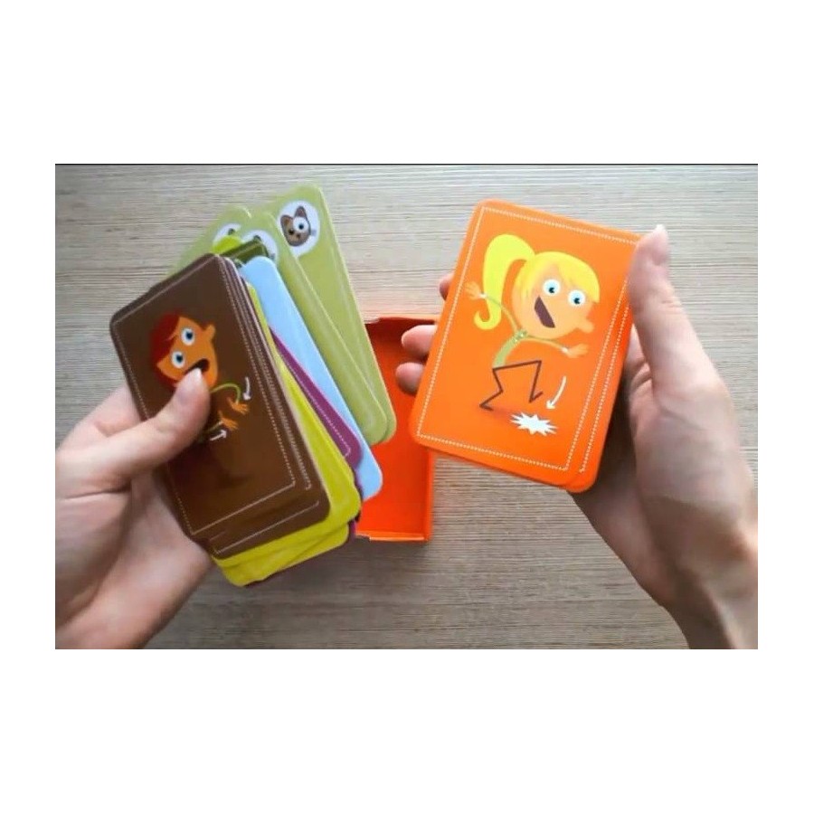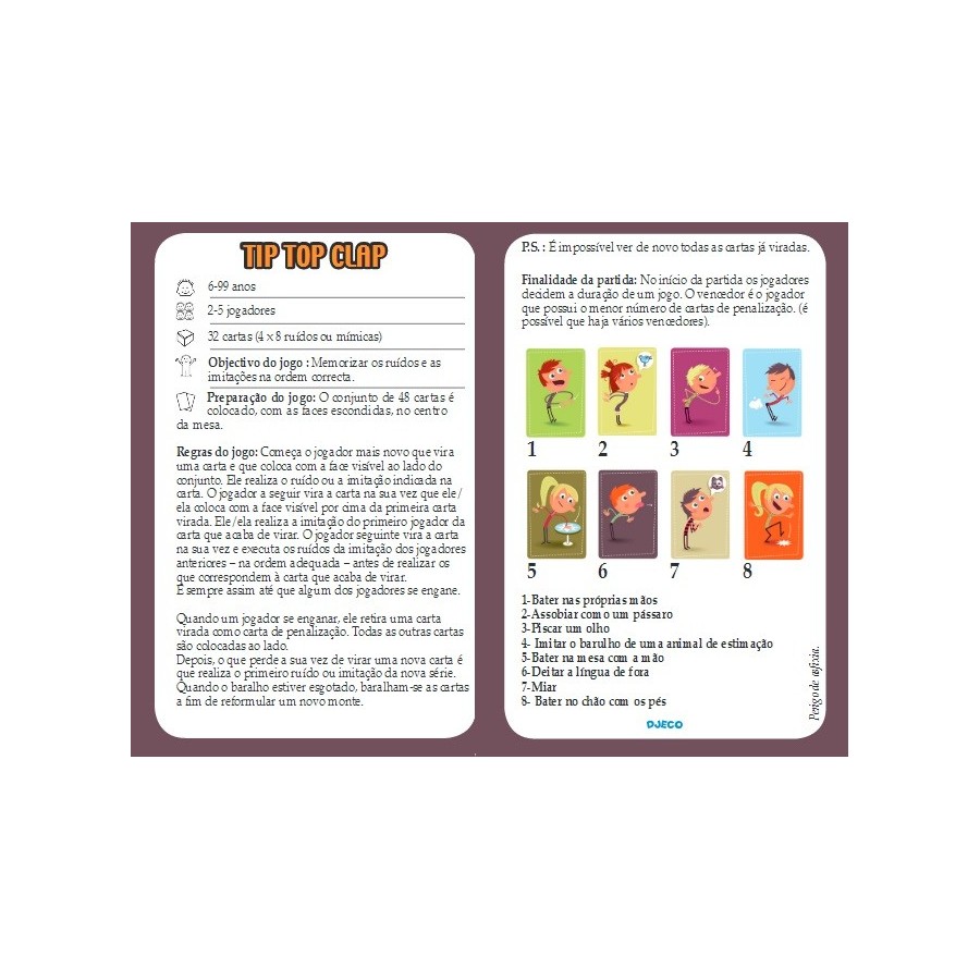 Tip Top Clap Tira uma carta e faz o ruído ou a mímica correspondente, o jogador seguinte tem que fazer o que o anterior jogador fez e o ruído/mímica da sua carta. O próximo a jogar…tem que fazer o ruído/mímica das jogadas anteriores e a da nova carta! Vamos ver quem vai memorizar e reproduzir a sequencia certa senão … volta tudo ao início! Parece confuso? Não!! Dá muita risada! Risos assegurados para este jogo de memória inédito!