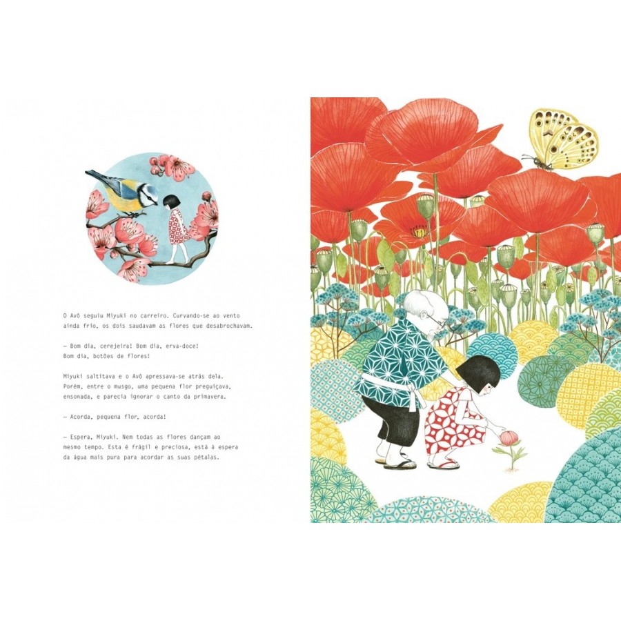 Miyuki está impaciente: é o primeiro dia de primavera! Tem pressa de ir ao jardim, onde tudo floresce. Tudo menos uma pequena flor, ainda em botão. Miyuki, ansiosa por despertá-la, parte numa aventura em busca da água mais pura. O avô diz-lhe: "Espera!", mas Miyuki só consegue pensar na sua flor que não desabrocha...