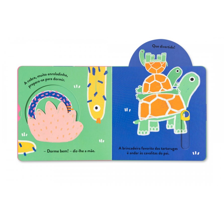 Com mecanismos deslizantes em cada página que revelam uma segunda ilustração, este livro promove os momentos de interação entre o leitor e o ouvinte. Os mecanismos deslizantes treinam a motricidade fina e, por serem de fácil utilização, estimulam uma utilização autónoma do livro pela criança.