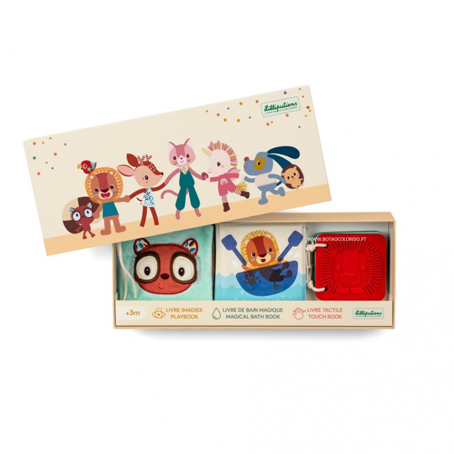 Este conjunto inclui: Um livro de tecido rico em texturas e ilustrações para explorar com as mãos e os olhos. | Um livro ilustrado de silicone macio e flexível, ideal para desenvolver as competências táteis. | Um livro mágico para o banho, cujas imagens surgem quando se entra em contacto com a água, para um momento de brincadeira e surpresa a cada banho!