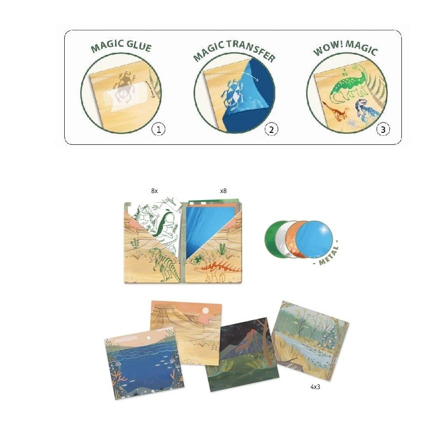 Decore os lindos cartões de ilustração fornecidos ou os livros escolares com este conjunto. Um processo criativo de duas etapas, cole o adesivo de cola mágica e aplique o acabamento decorativo. Uma actividade original e divertida. Contém uma bolsa de armazenamento, 8 folhas de cola mágica, 10 folhas de transferência mágica e 12 cartões para decorar.