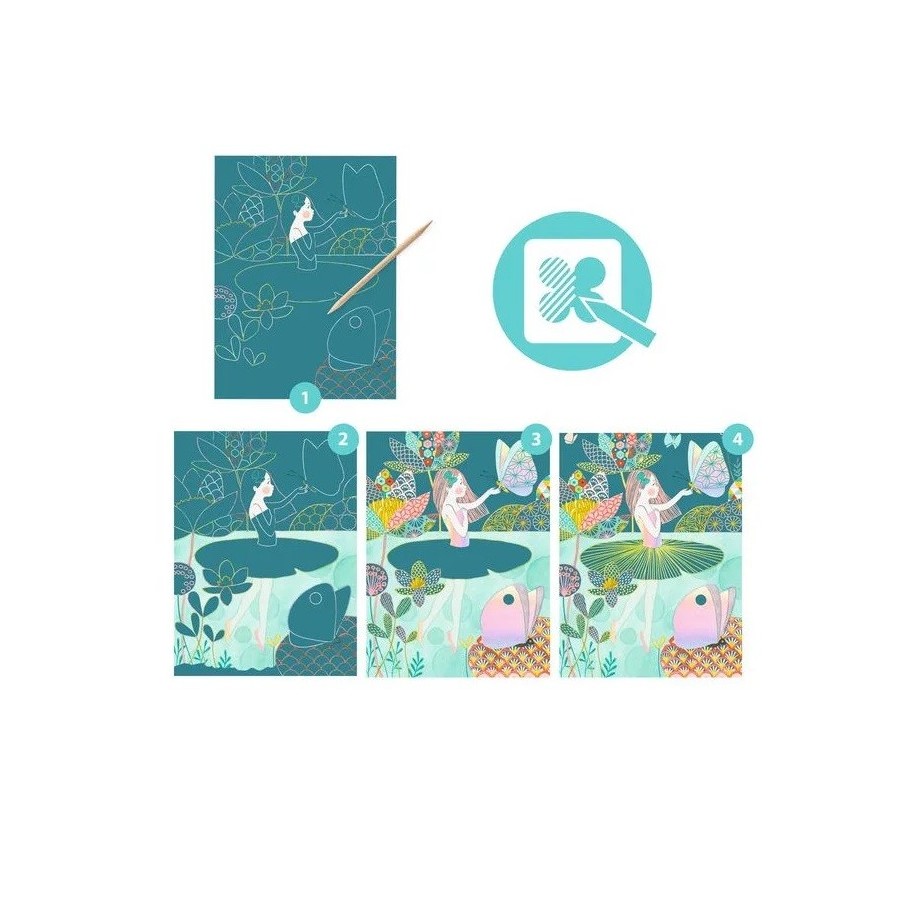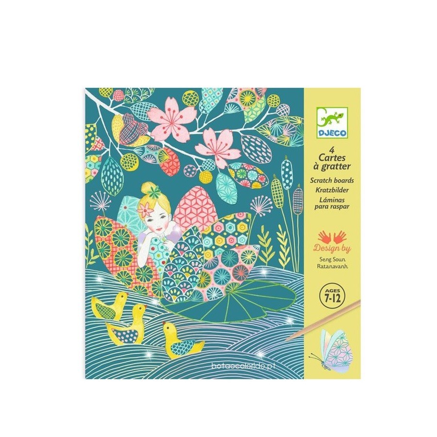 Raspe as cartas com a ferramenta fornecida para revelar estas imagens maravilhosas. Contém 4 cartões de 15 x 20cm, uma ferramenta de raspar de madeira e instruções completas. Design de Seng Soun Ratanavanh Idade: 7-12 anos