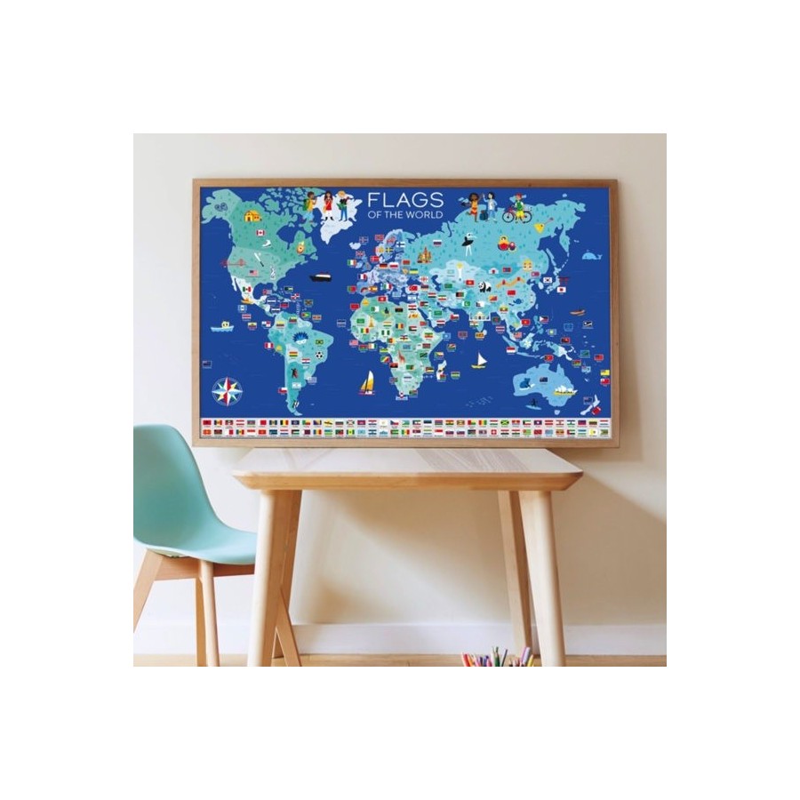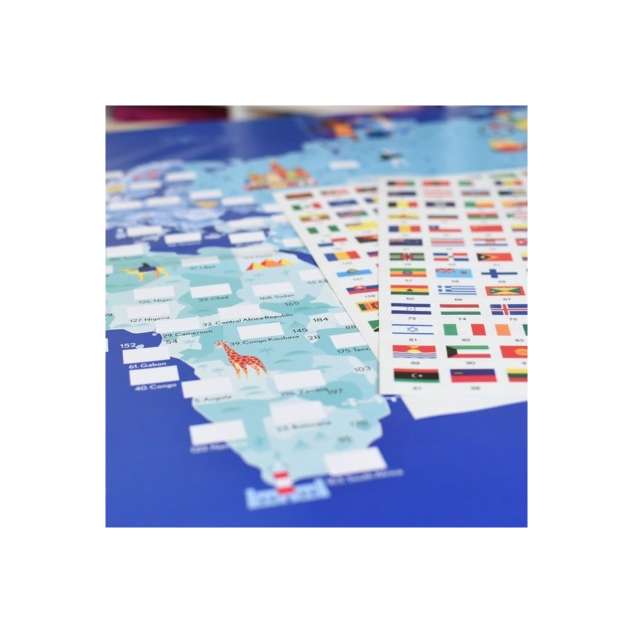 Inclui um grande poster educativo para completar com 200 autocolantes reposicionáveis representando as bandeiras de diferentes países. Ao colar os próprios autocolantes no poster, para além da concentração também desenvolve a observação e conhecimento. Assim, a aprendizagem é feita de uma forma natural e sem esforço. O poster é uma bela peça de decoração para o quarto.