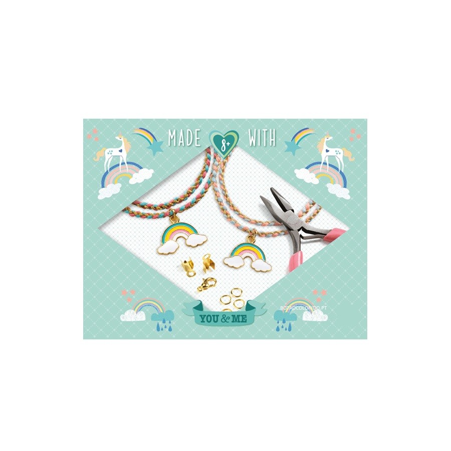 Um lindo conjunto de jóias com lindos pendentes e muitos materiais para ajudá-lo a criar suas próprias pulseiras de charme individuais. Dentro do conjunto, você encontrará uma variedade de lindas miçangas e fios com instruções. Se vai oferecer as suas pulseiras, o conjunto inclui 2 bonitos sacos de organza e um lindo cartão para lhe dar um toque pessoal.