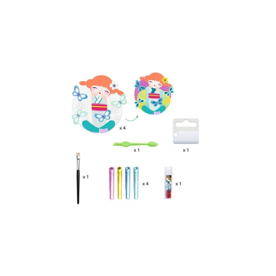 Decorar com glitters para fazer cintilar as quatro magníficas ilustrações recortadas com pormenores requintados. Tamanho da caixa: 23x23x4 cm. Contém todo o material necessário para esta fantástica actividade!