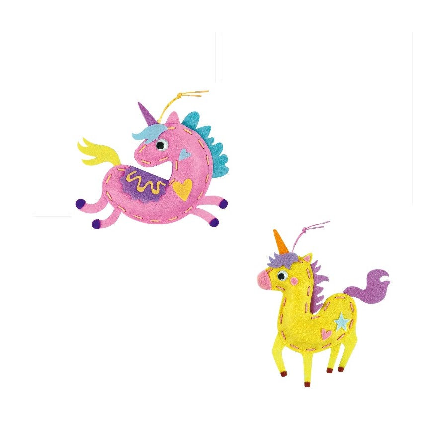 As crianças agora já podem desenvolver suas habilidades de costura enquanto se divertem! A linha grossa e os orifícios grandes facilitam o processo de costura para mãos mais pequeninas. Este conjunto contém 2 unicórnios super fofinhos, juntamente com folhas de feltro pré-cortadas, adesivos decorativos em feltro, olhos de plástico, enchimento de algodão e cordões coloridos.