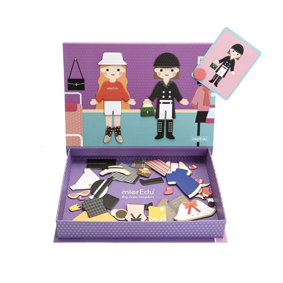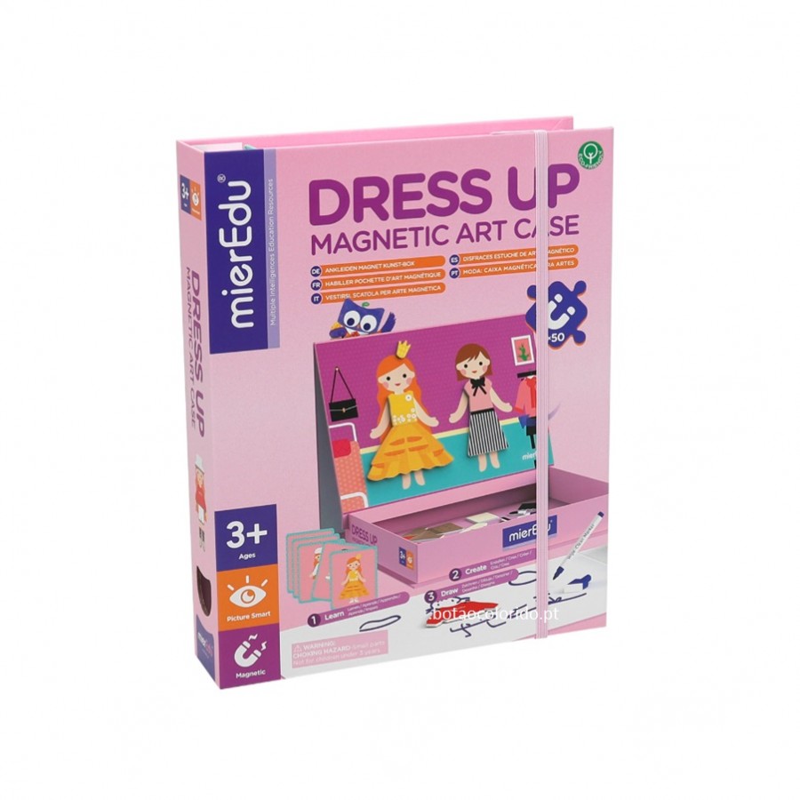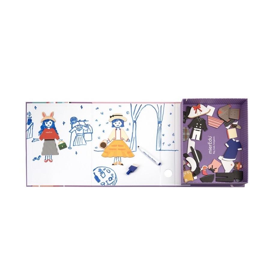 Diverte-te a vestir as duas amigas no cenário magnético, com 50 roupas e acessórios fantásticos! Inspira-te nos 10 cartões com desenhos ou torna-te uma designer de moda e cria os teus próprios modelos! A caixa aberta transforma-se num quadro branco grande, onde podes dar asas à tua imaginação, desenhar e inventar histórias infinitas com as roupas, os acessórios e a caneta com apagador. Tudo isto numa caixa original, de fácil arrumação e transporte.