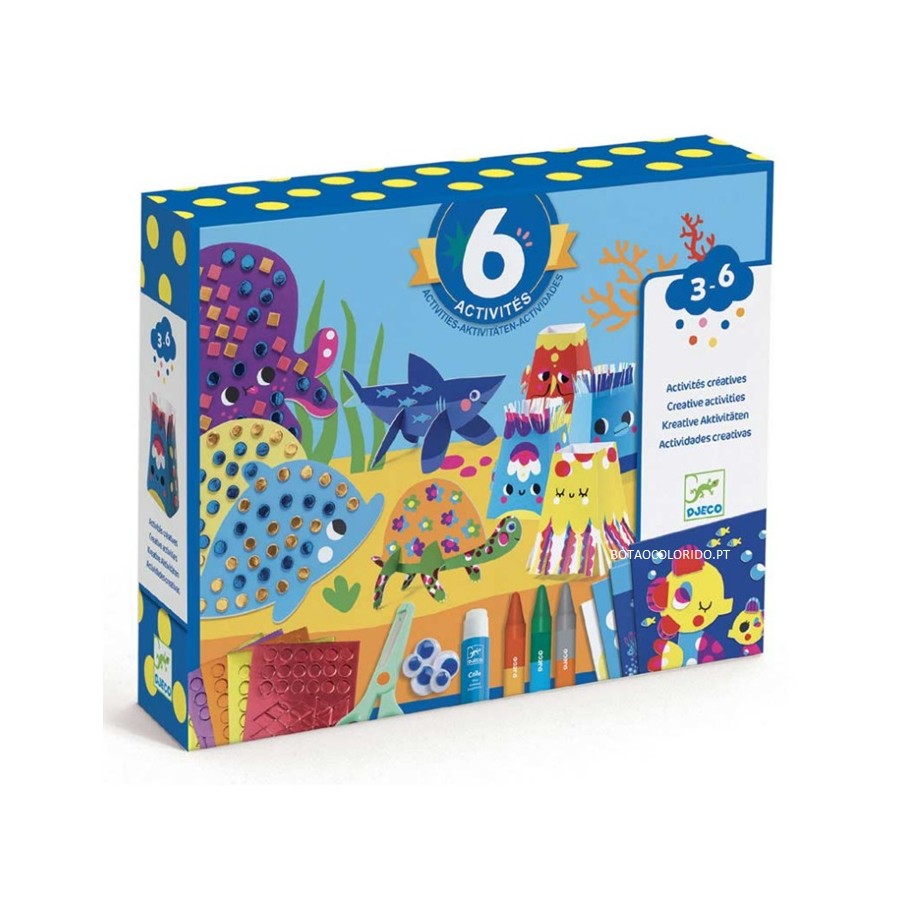 Aqui está um grande conjunto de 6 atividades criativas sobre o tema do mar: colagem, pintura, mosaicos, corte, montagem e transferências. Há sempre uma actividade para fazer! Horas de atividades manuais para descobrir diferentes técnicas criativas. Todos os acessórios são fornecidos para que as crianças possam realizar qualquer atividade, seguindo os seus desejos e curiosidades. Um livro com descrições passo a passo de cada etapa irá guiá-los em suas criações.
