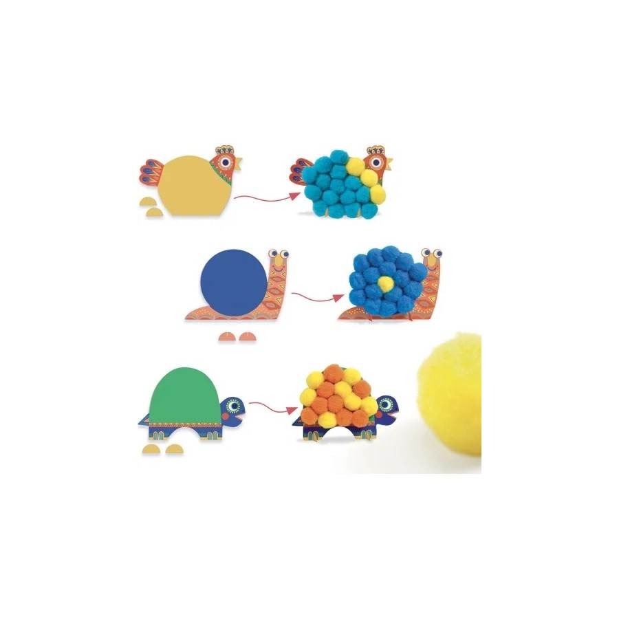 Uma atividade de colagem para completar os 3 animais com grandes pompons. Seguindo os modelos do caderno explicativo, a criança cola os grandes pompons coloridos nas partes auto-adesivas dos 3 animais. Surpresa, aparecem 3 animais macios para acariciar!