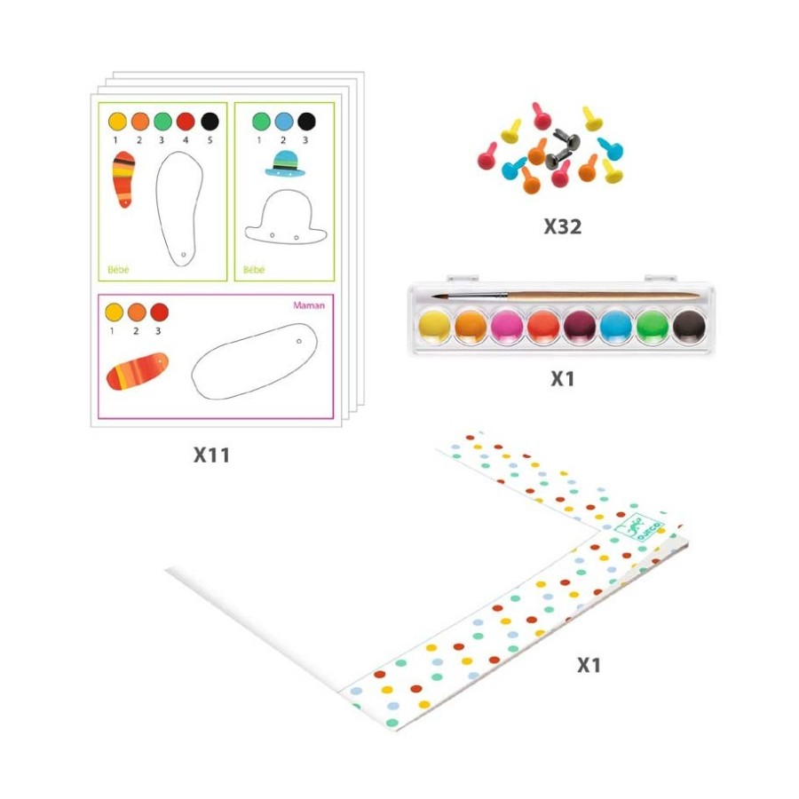 Conteúdo: 12 folhas para pintar incluindo formas removíveis, 1 paleta de 8 cores de guache e 1 pincel, 32 fixadores, 1 toalha de mesa protetora e 1 livro de instruções passo a passo.