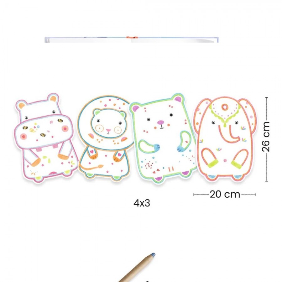 Um conjunto com 12 imagens para colorir com um lápis de cor grande, adequado para crianças pequenas. A criança pinta os animais selvagens usando o lápis para descobrir o que está escondido. É mágico: o lápis apenas marca determinadas áreas, aparecem padrões e revelam surpresas. O brinquedo desenvolve habilidades manuais.