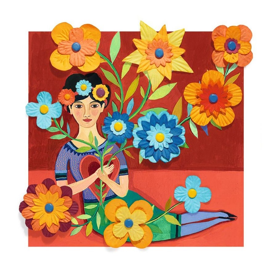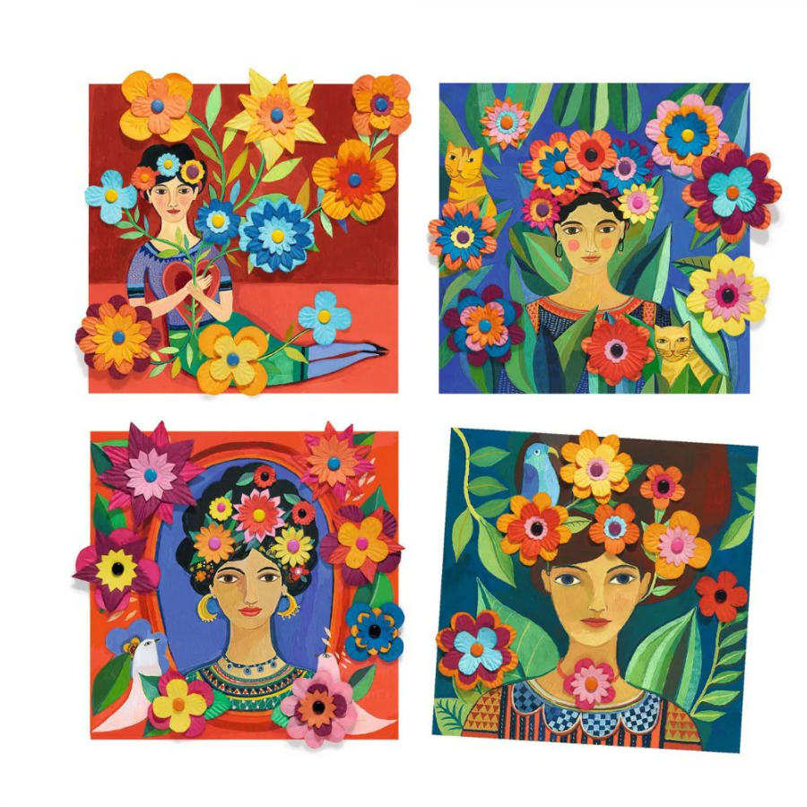 Inspirada na obra de Frida Kahlo, onde a natureza luxuosa e as cores vibrantes são uma ode à vida, ao amor e à feminilidade, Aurélia Fronty oferece 4 quadros para que possa incrementar montando e colando flores de papel em relevo.