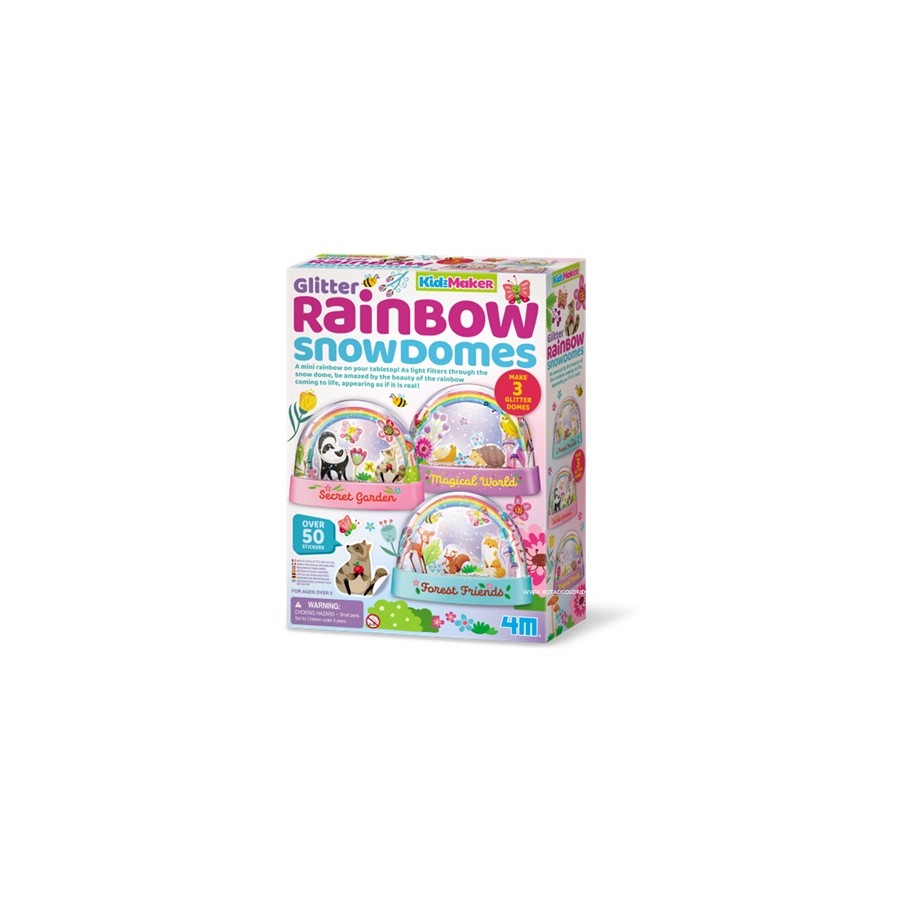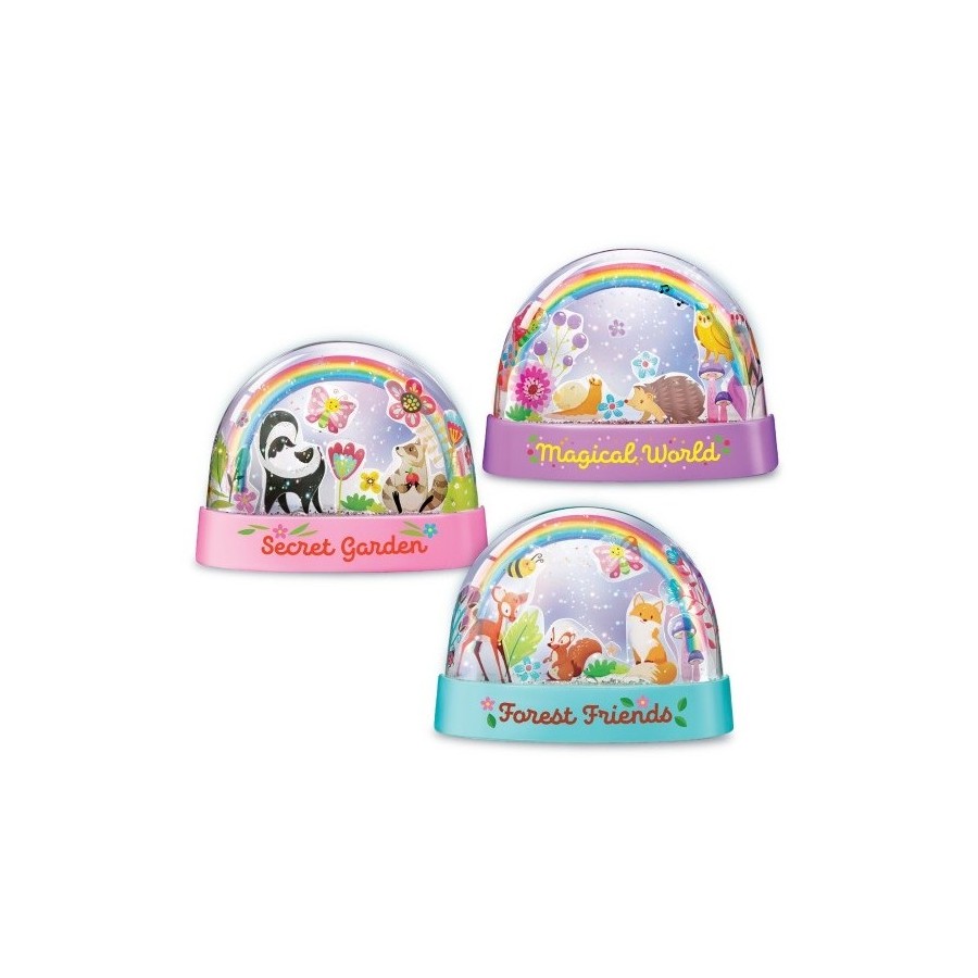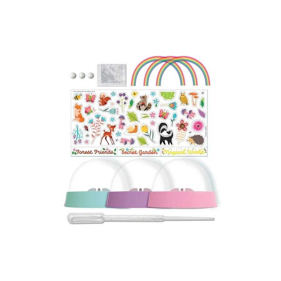 Contém: 3 cúpulas de neve de plástico, 3 arco-íris de filme transparente, 1 folha de autocolantes, 1 conta-gotas, 1 pacote de glitter biodegradável, 3 tampas de borracha e instruções detalhadas. Necessário mas não incluído: um palito.