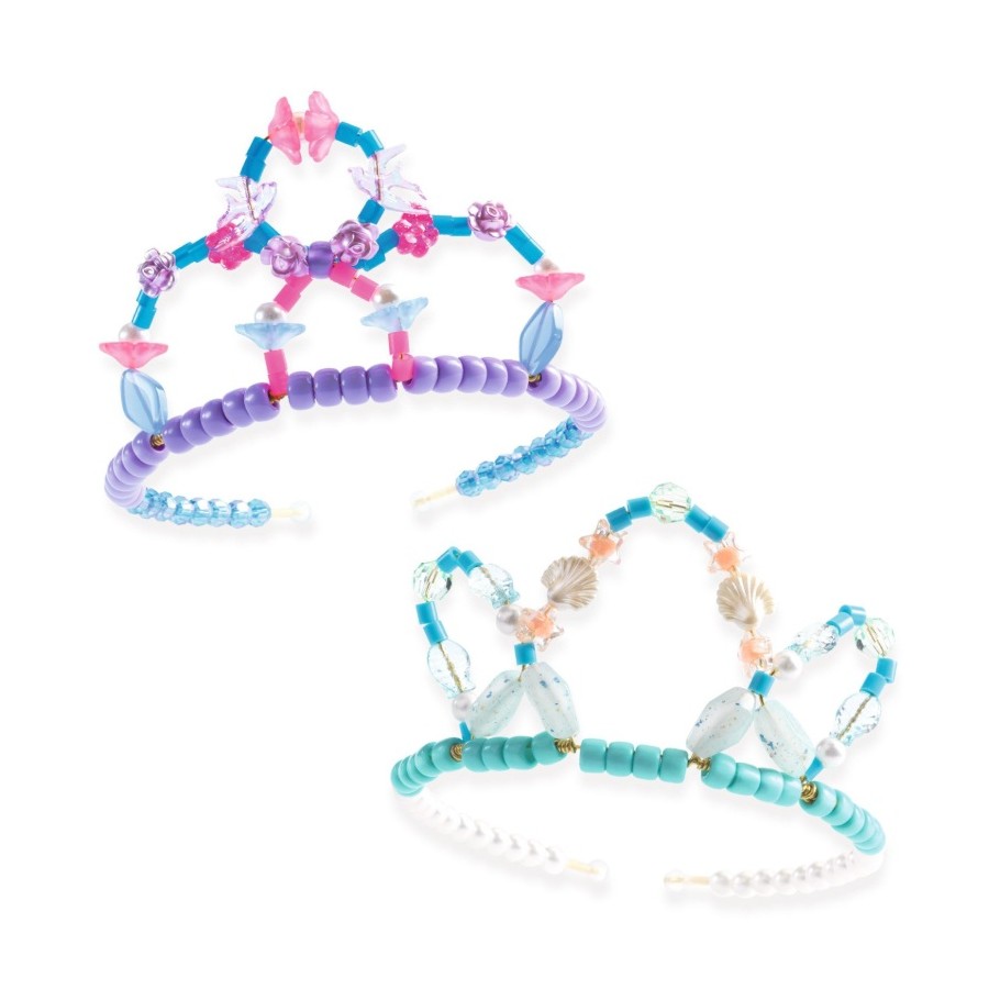 Este conjunto inclui 240 contas diferentes, 2 tiaras douradas e 6m de fio metálico flexível para moldar e dar forma às suas tiaras. Com instruções passo a passo fáceis de seguir, o seu pequeno príncipe e as suas princesas podem fazer estas coroas para uma festa ou festa do pijama usando contas de conchas azuis e flores cor-de-rosa!