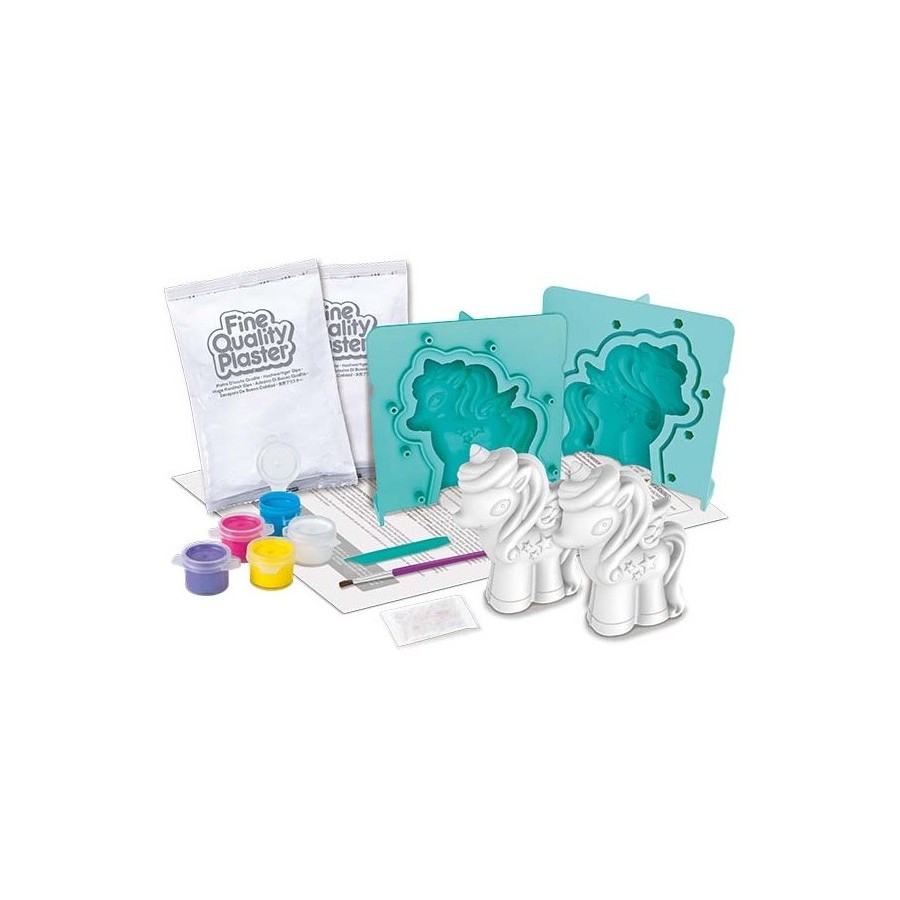 Contém: molde de unicórnio (2 peças, montagem necessária), ferramenta de escultura, pó de gesso para 2 unidades, tira de potes de tinta com 5 cores, pincel, pó de glitter e instruções detalhadas. O conteúdo é suficiente para fazer 2 unicórnios com 7cm de altura.