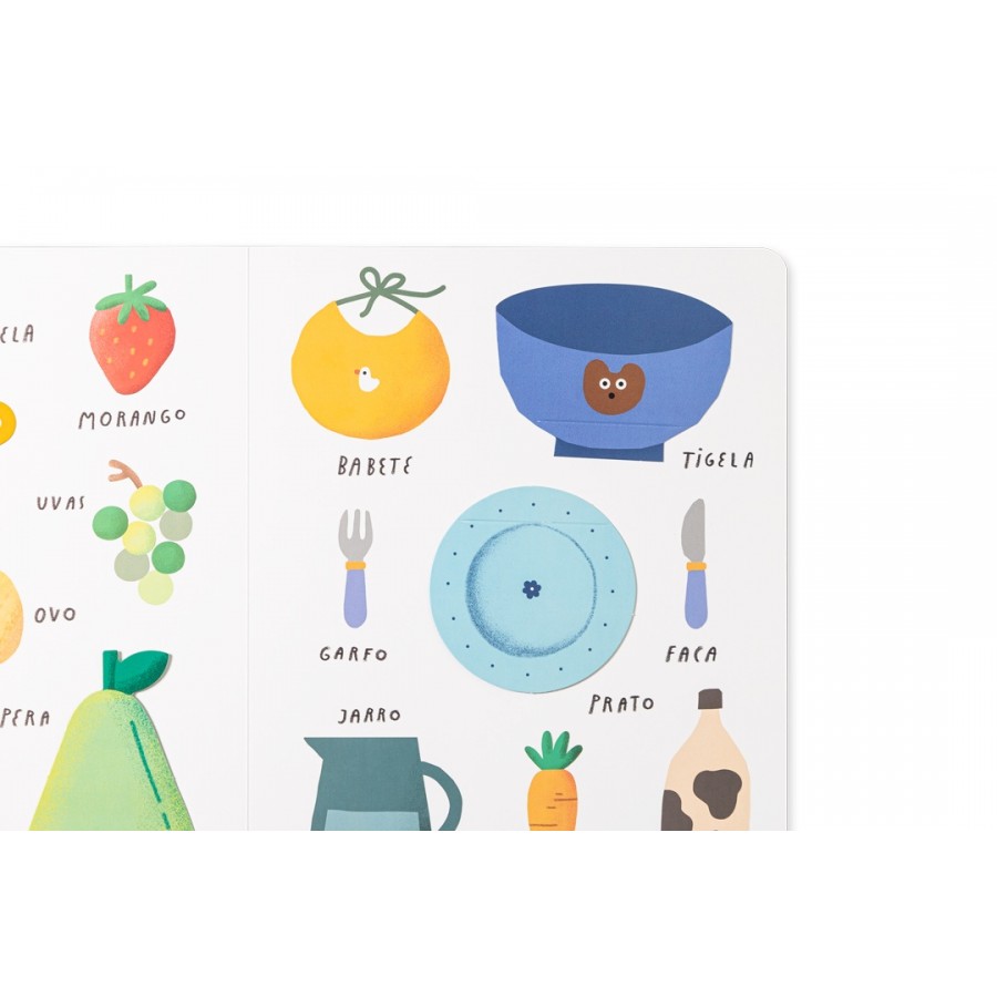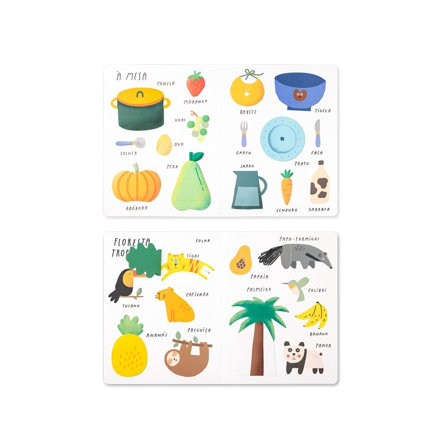 Dicionário por imagens com abas com vocabulário diverso sobre diferentes temáticas (casa, à mesa, praia, savana, bosque, floresta tropical e cidade). Incentiva a partilha de ideias entre o leitor e o ouvinte e ideal para brincadeiras e/ou jogos de observação e associação. Este livro poderá ser manipulado por crianças de várias idades, desenvolve a motricidade fina.