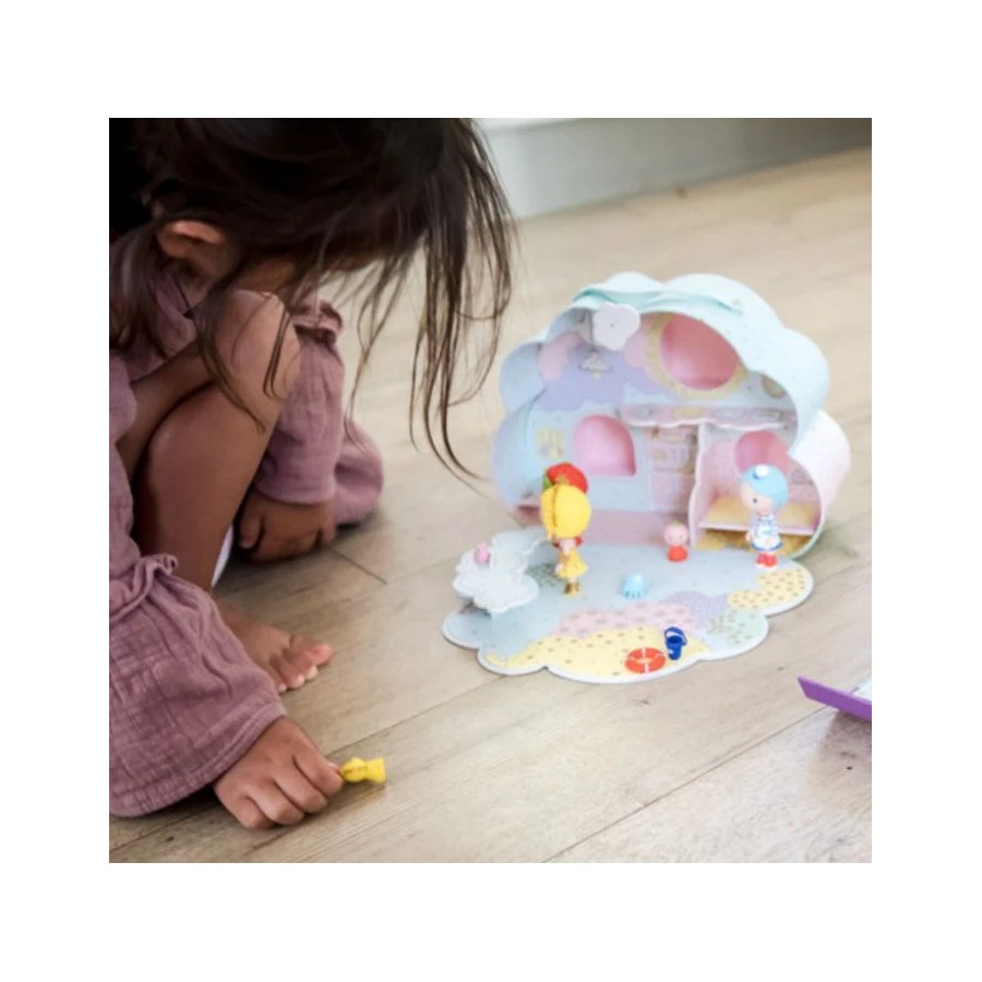 A casa das companheiras Sunny e Mia é uma adorável mala em forma de nuvem com ilustrações suaves. Quando a abre, descobre uma decoração de casa de bonecas: um quarto, uma cozinha e uma mesa para comer. O suficiente para se sentir nas nuvens!